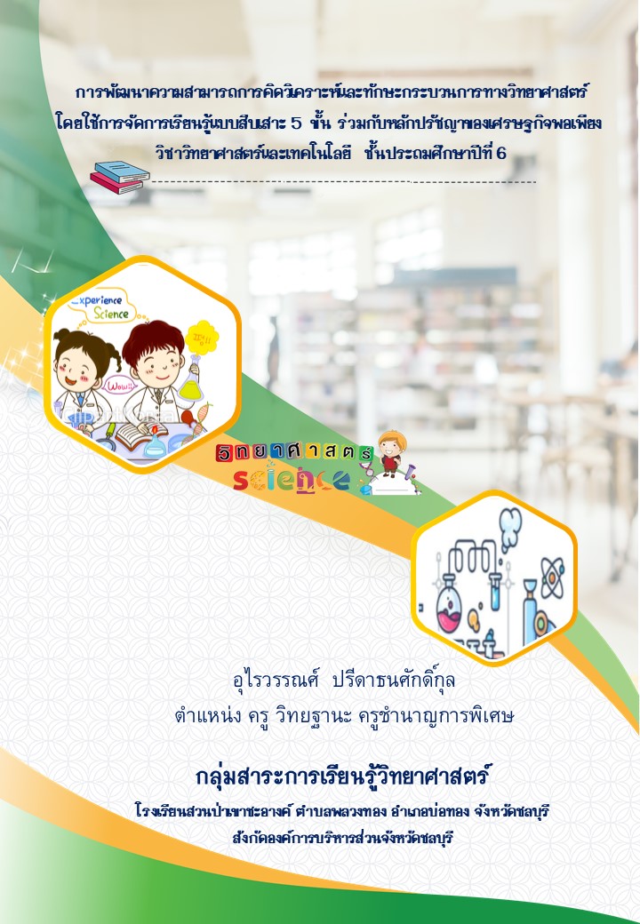 การพัฒนาความสามารถการคิดวิเคราะห์และทักษะกระบวนการทางวิทยาศาสตร์โดยใช้การจัดการเรียนรู้แบบสืบเสาะ 5 ชั้น ร่วมกับหลักปรัชญาของเศรษฐกิจพอเพียงวิชาวิทยาศาสตร์และเทคโนโลยี ชั้นประถมศึกษาปีที่ 6 |